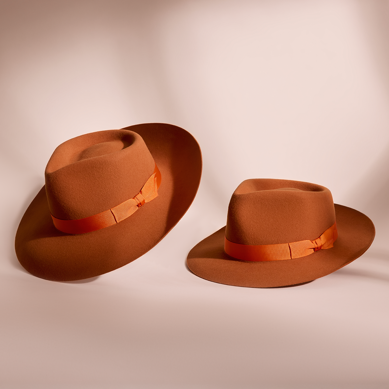 CARE: Avoid handling your hat by the crown as you could wear out the front pinch. Holding your hat by the brim is the best way to handle any hat. We advise against wearing your hat in heavy rain. If your fur felt hat does get wet, shake off any excess water and allow to dry naturally placed brim faced down at room temperature. Never force dry your hat using any form of heat source. If required, use your hands to gently reinforce the shaping of the crown and brim. When completely dry, lightly brush to clean.